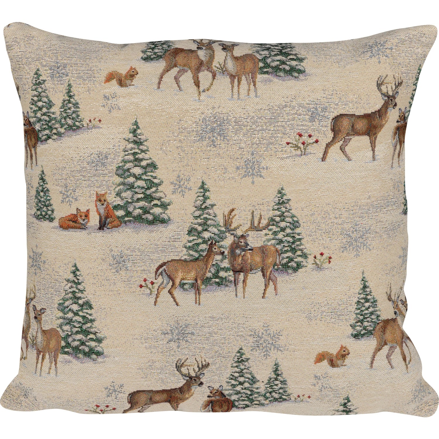 Kuschelige Gobelin Kissenhülle mit detailreichen Waldtieren. Der Winterwald wird durch silberne Akzente verzaubert.