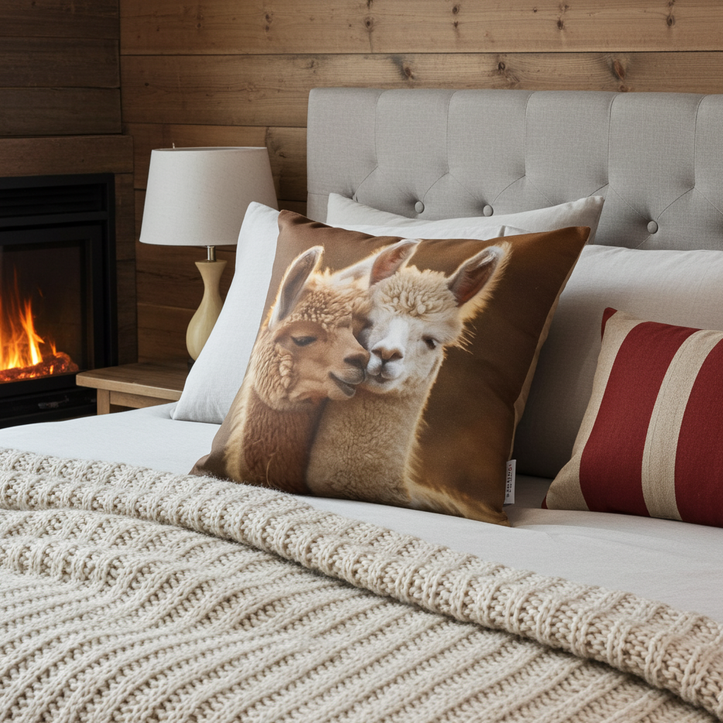 Flauschiges Duo! Kissenhülle (45x45 cm) "Alpaka Liebe". Herzliches Fotomotiv mit zwei kuschelnden Alpakas im Sonnenlicht. Rückseite in Caramel.