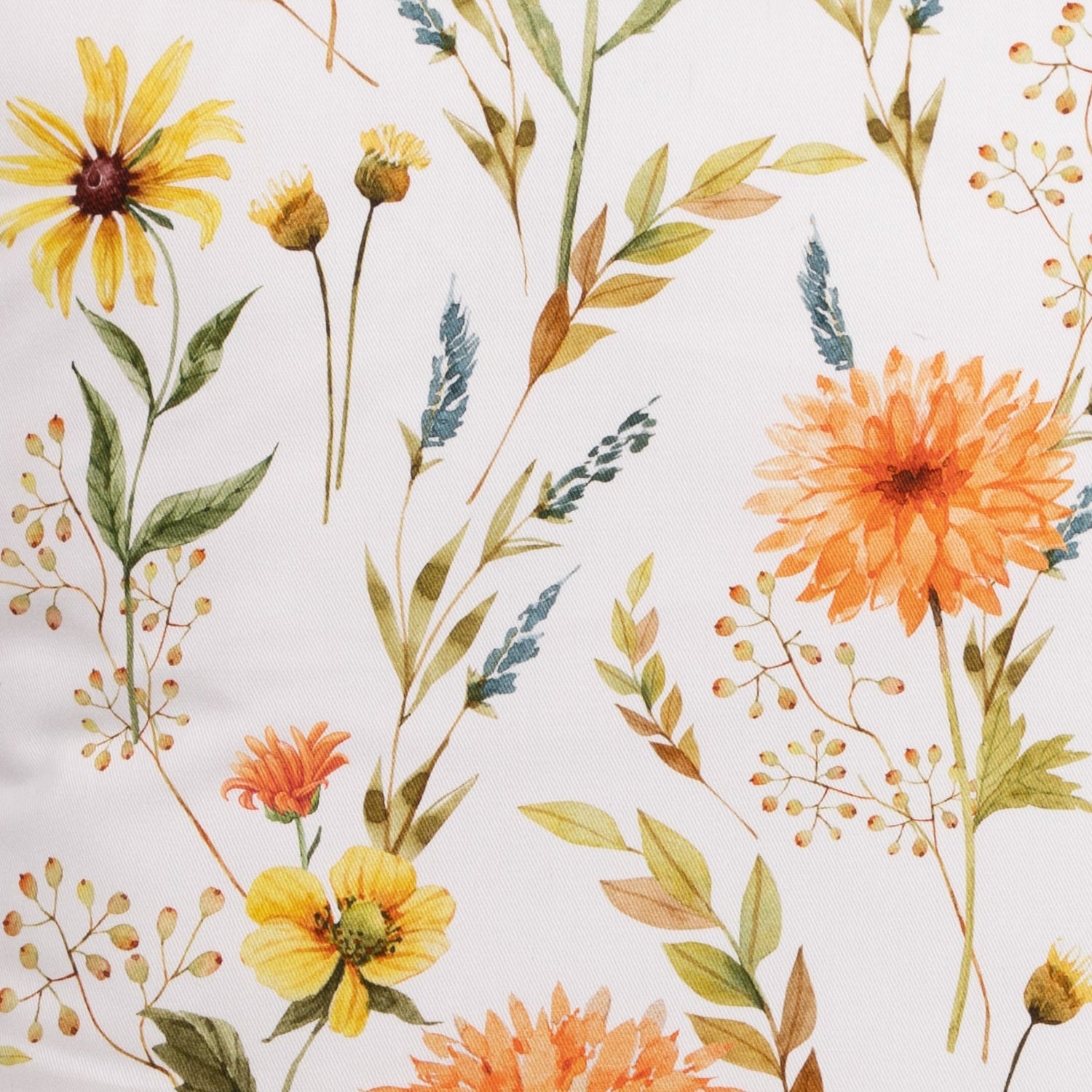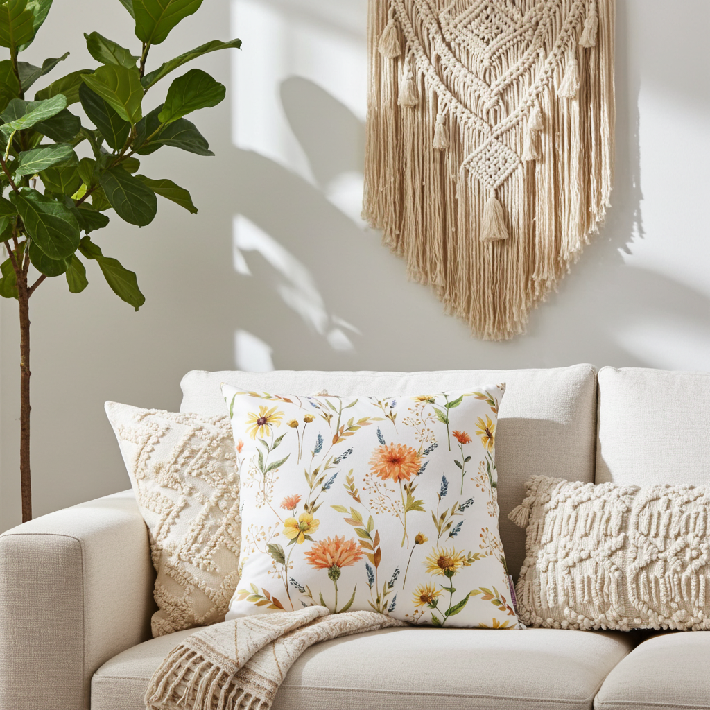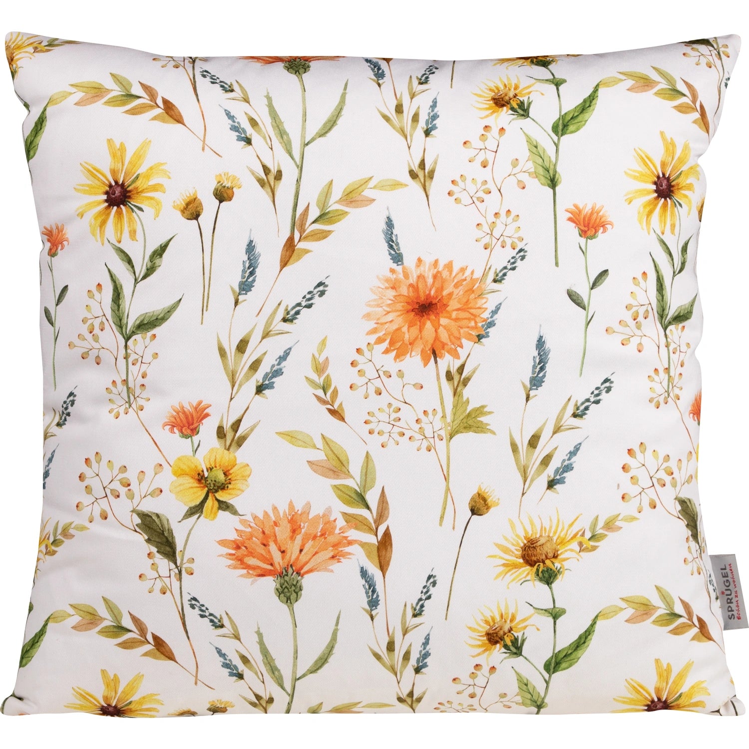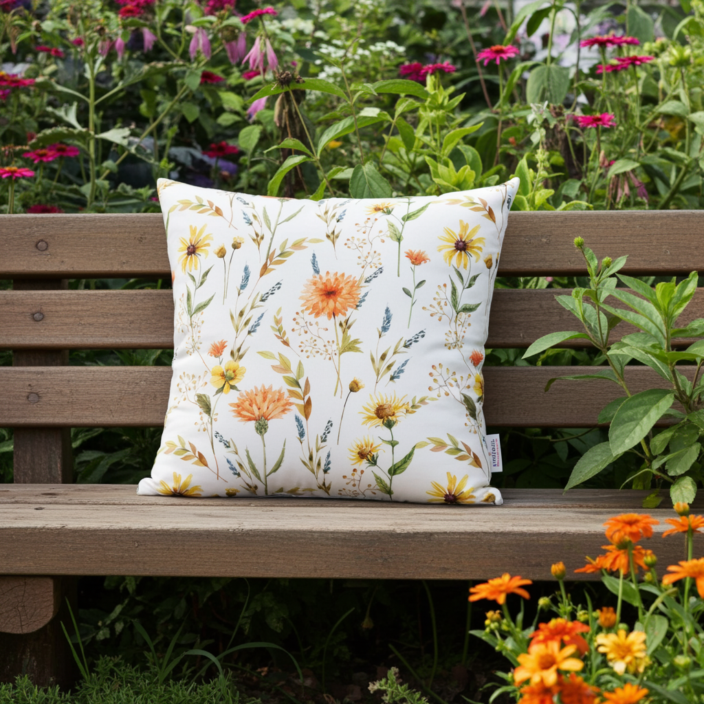Die Kissenhülle „Frühlings-Sinfonie“ überzeugt mit einem feinen, modernen Floralmotiv. Auf weißem Hintergrund entfalten sich filigrane Frühlingsblumen und zarte Zweige in Orange-, Gelb- und Blautönen, ergänzt durch frische grüne Blätter. Das dezente Aquarell-Design wirkt leicht, harmonisch und zeitlos und bringt eine ruhige, frühlingshafte Note in Ihr Wohnambiente. Ideal als stilvoller Akzent für Sofa oder Bett und vielseitig kombinierbar mit hellen wie natürlichen Einrichtungskonzepten.