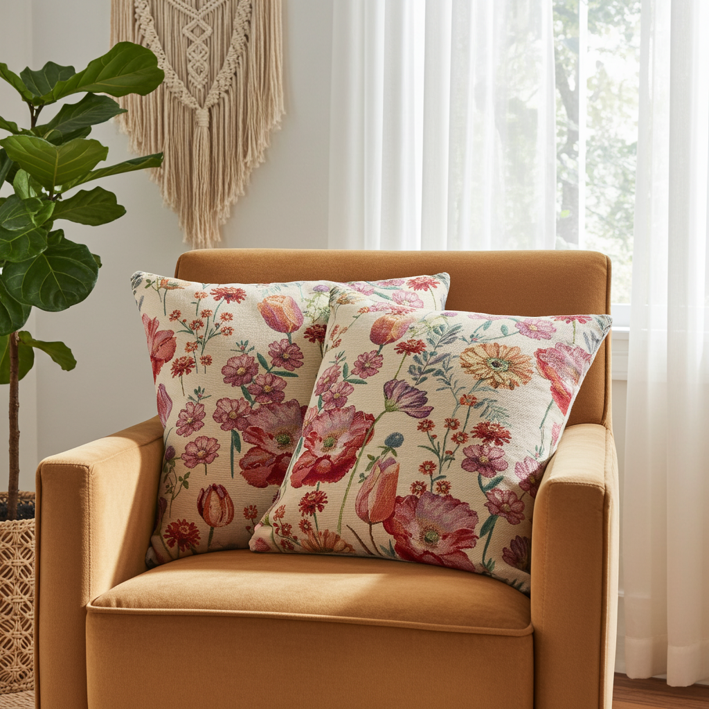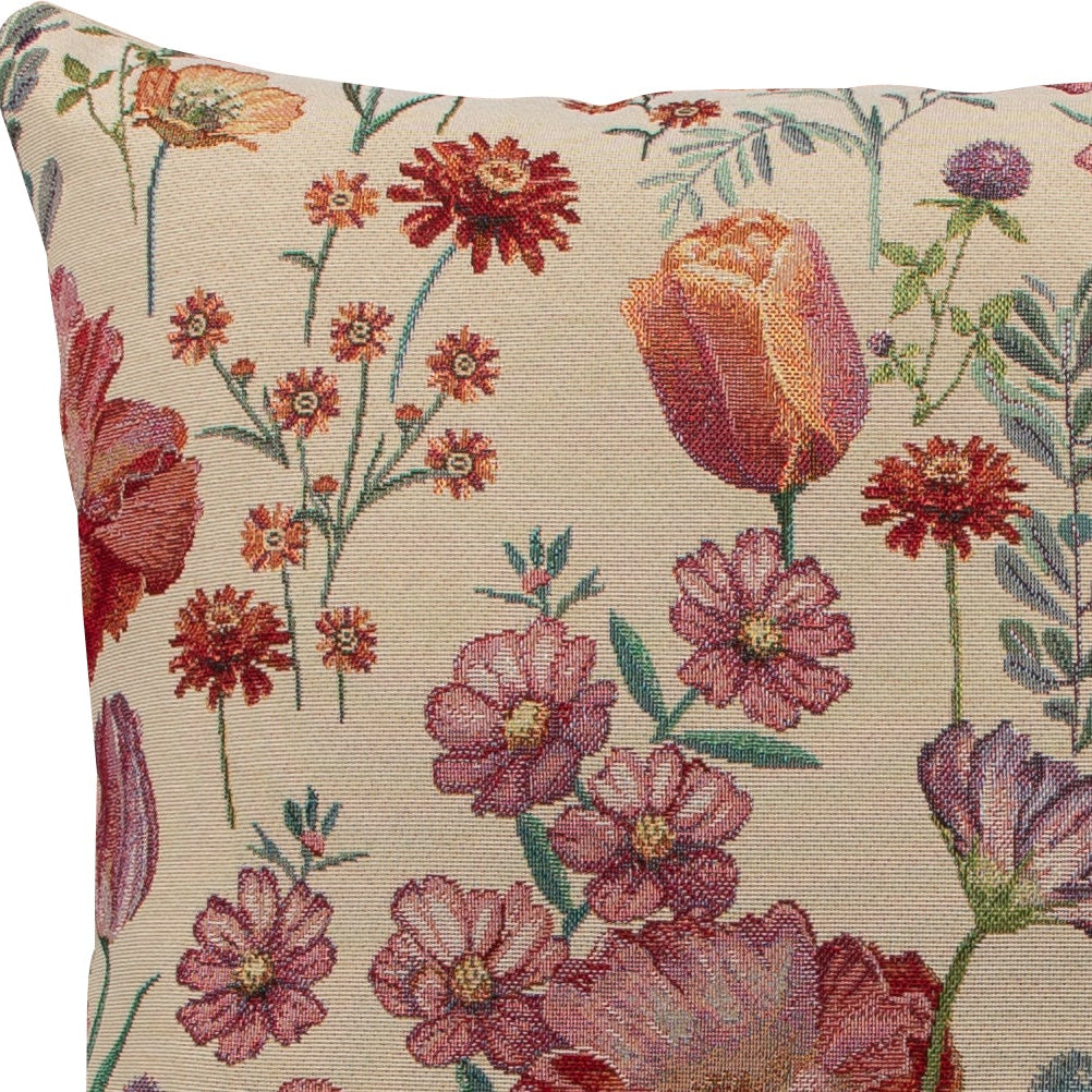 Die Gobelin Kissenhülle „Frühlingserwachen Negrita“ 50 × 50 cm zeigt ein hochwertiges, florales Design auf beigem Grund. Verschiedene blühende Frühlingsblumen und Zweige in Rot-, Pink-, Rosa- und Orangetönen entfalten sich harmonisch im Motiv. Die sich teilweise überlagernden Blüten sorgen für Tiefe, während der ruhige Hintergrund dem Design eine ausgewogene, elegante Wirkung verleiht. Die Kissenhülle aus robustem Gobelin-Stoff bringt eine frische, zugleich stilvolle Note in Ihr Wohnambiente und eignet sich ideal für Sofa oder Bett.