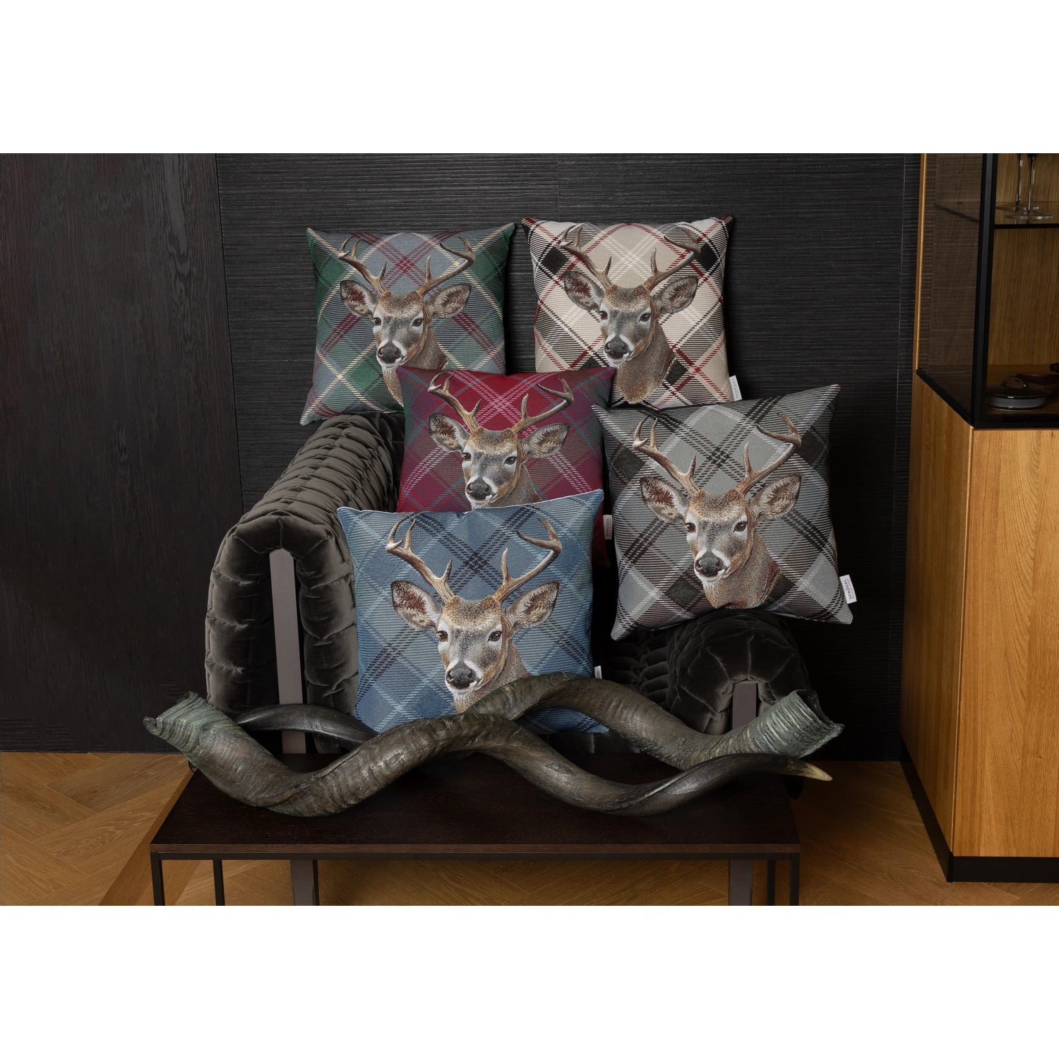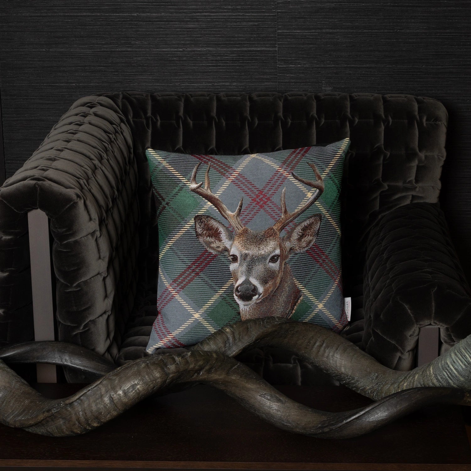 Gobelin Kissenhülle mit Hirsch im Chalet-Stil - Check Deer grün 45x45 cm