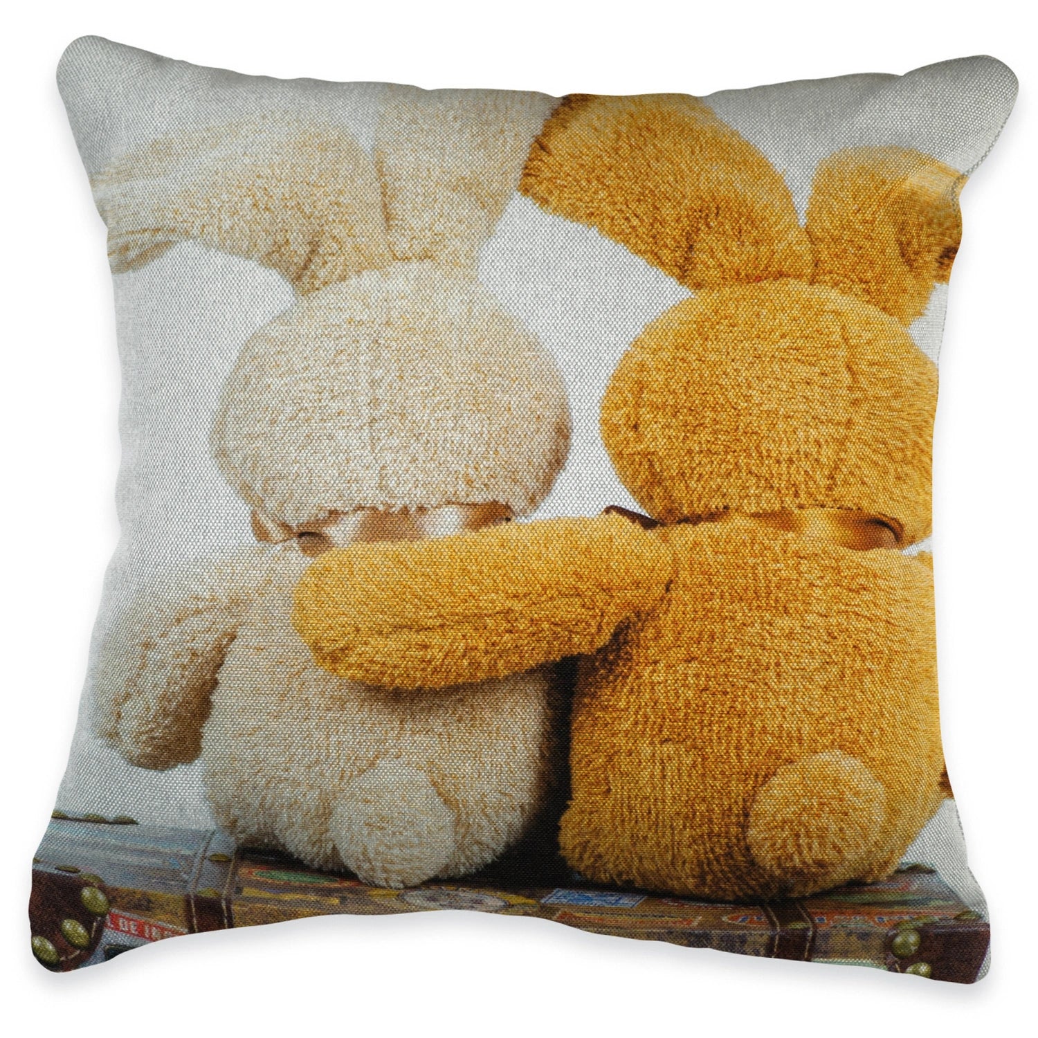 Die Kissenhülle „Kleine Hasenfreunde“ vermittelt nostalgischen Charme mit einem herzlichen Fotomotiv zweier Plüschhasen auf antikem Koffer – ideal für eine gemütliche Osterdekoration.