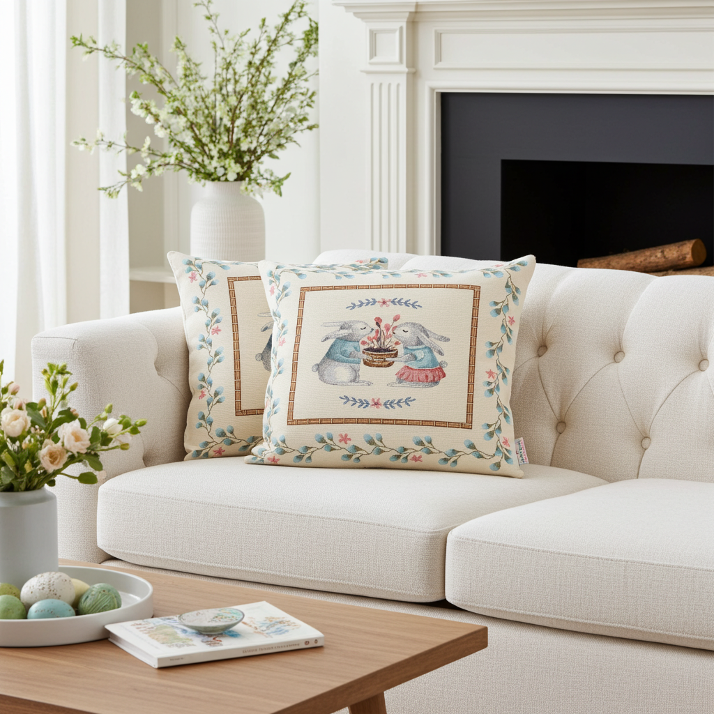 Die Kissenhülle „Osterduft“ bringt Frühlingszauber in Ihr Zuhause. Das süße Hasenmotiv kombiniert mit floralen Elementen sorgt für eine freundliche, wohnliche Atmosphäre.