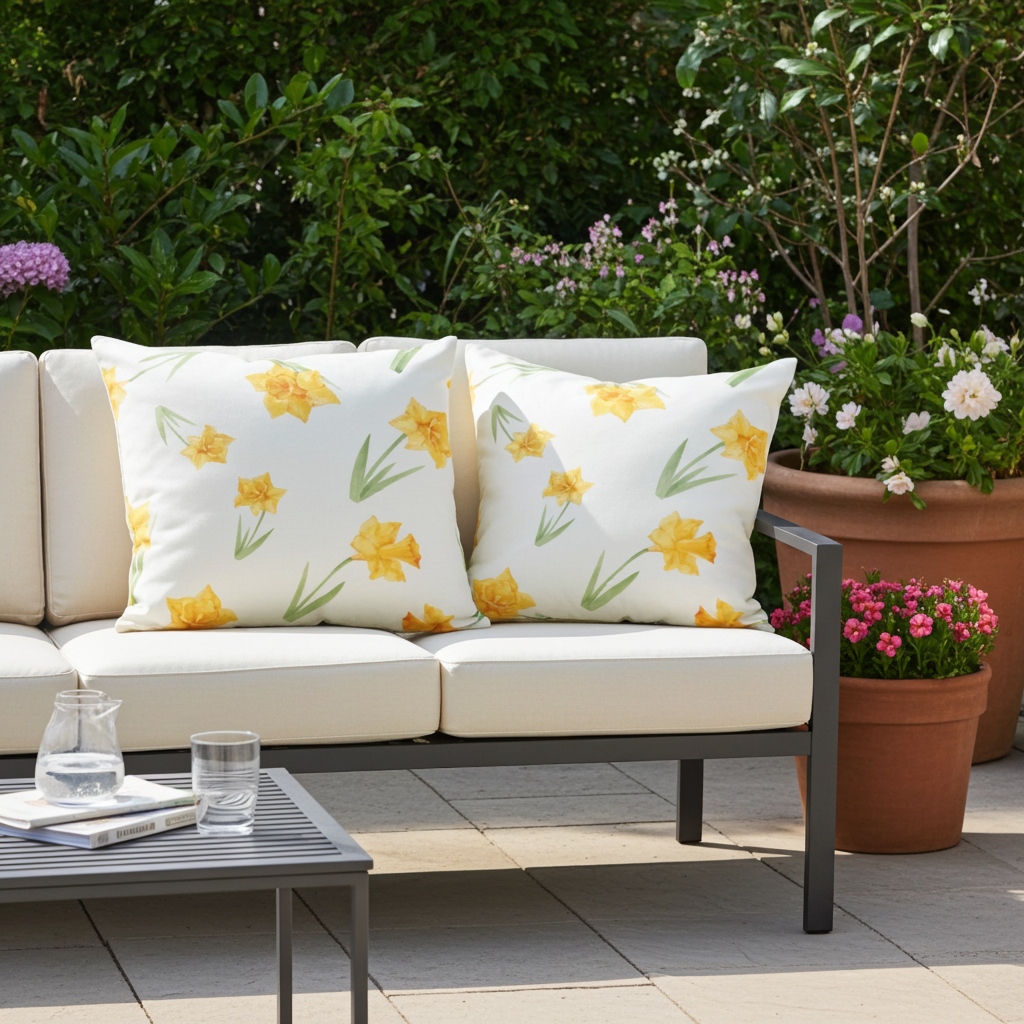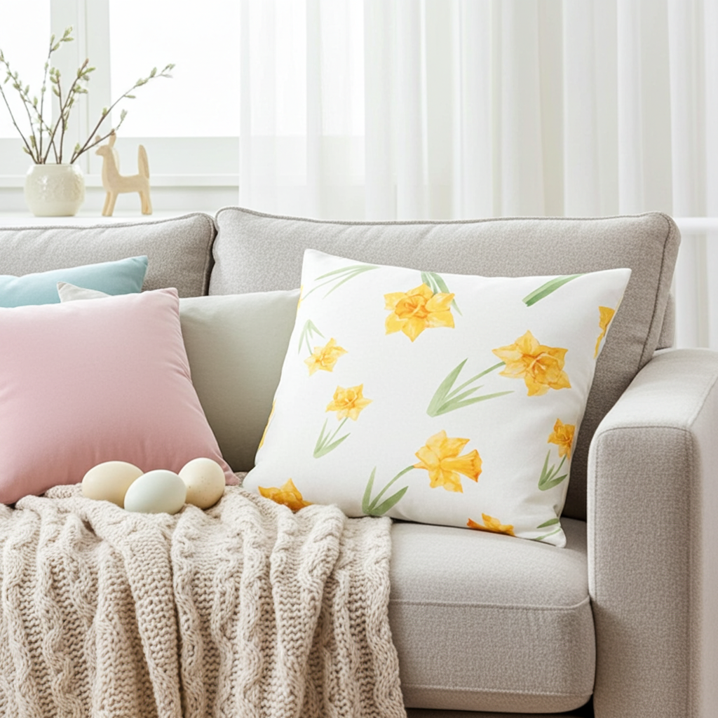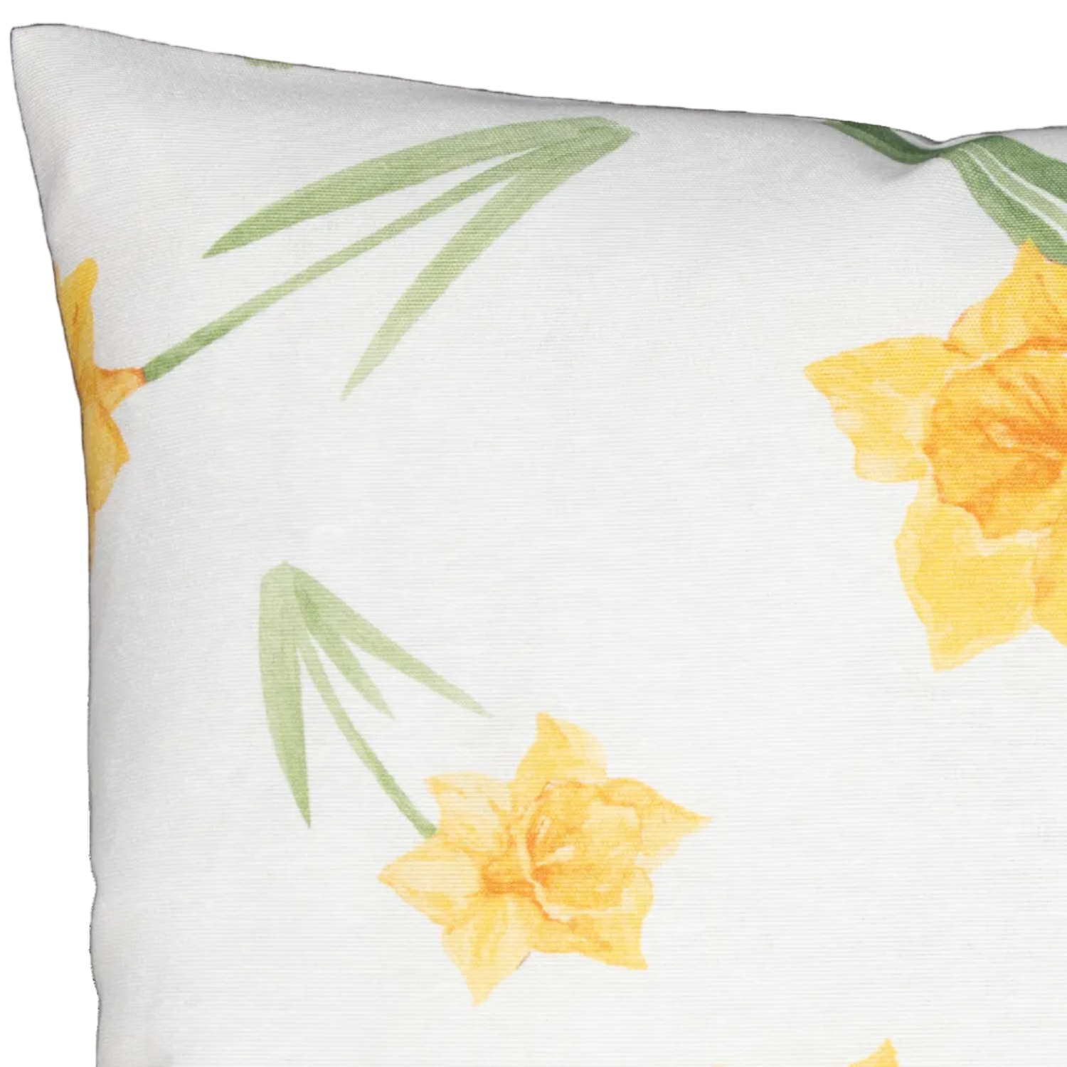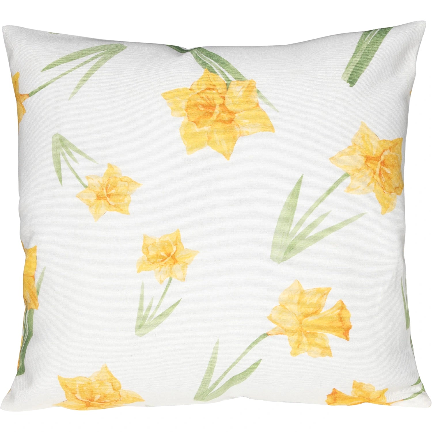 Die Kissenhülle „Osterglocken Gruß“ setzt mit leuchtend gelben Narzissen auf weißem Grund frische Akzente. Ideal, um Sofa oder Sessel frühlingshaft in Szene zu setzen.