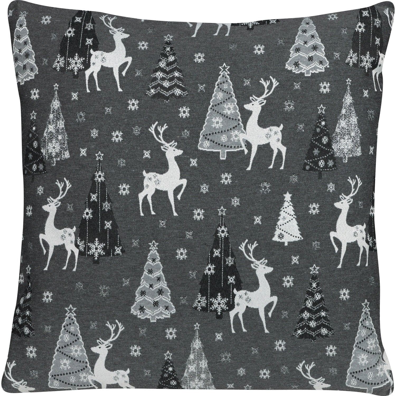Kompakte Kissenhülle in Grau mit Rentier- und Tannenmotiv. 3% metallisierte Fasern sorgen für festliches Schimmern.