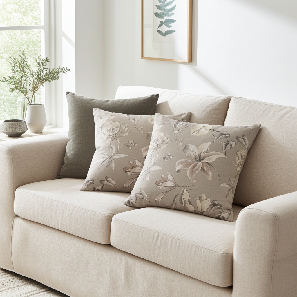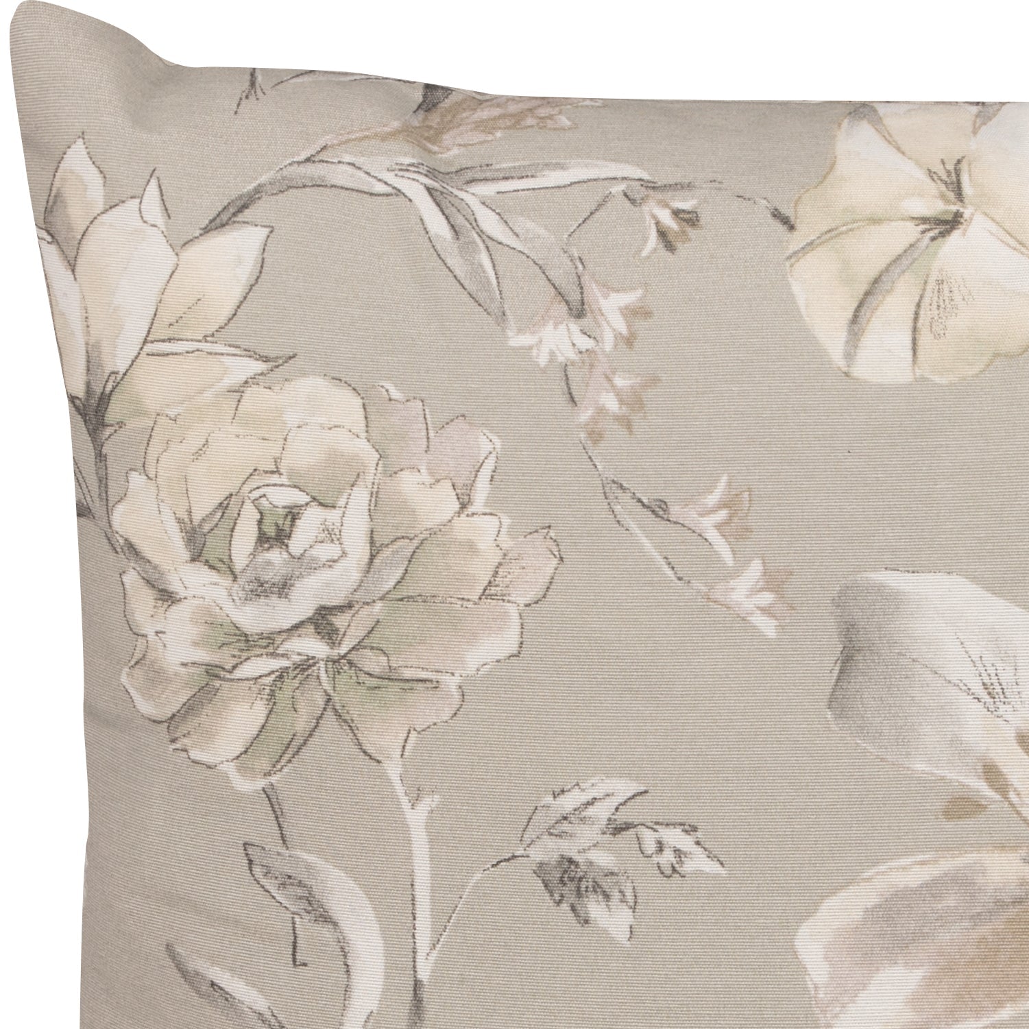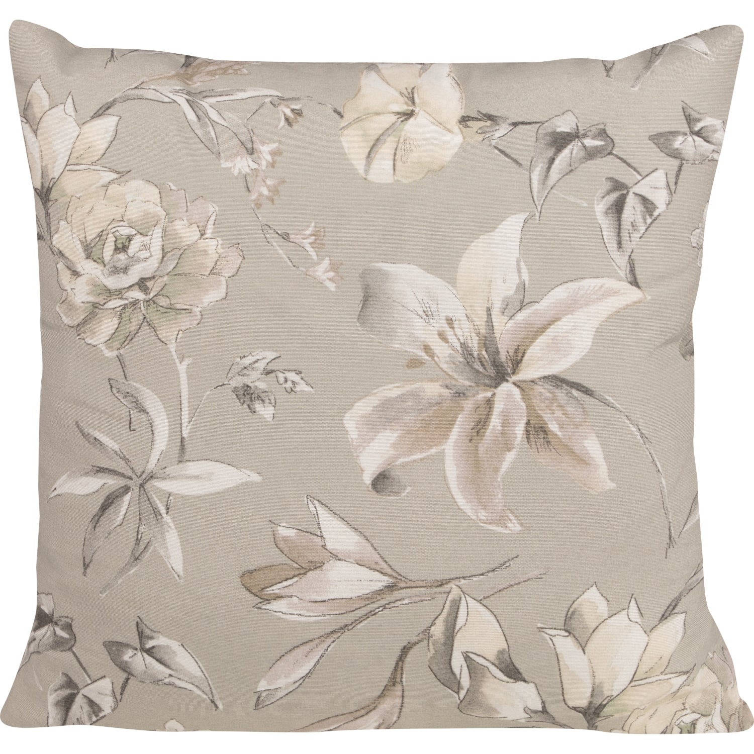 Die Kissenhülle „Kantu Florales“ überzeugt mit einem eleganten, grafischen Blumendesign in dezenten Naturtönen. Vor grau-beigem Hintergrund entfalten sich gezeichnete Rosen, Lilien und Blätter in hellen Nuancen mit weißen und grauen Schattierungen. Das stilvolle Motiv wirkt ruhig und modern und verleiht Ihrem Wohnambiente eine zeitlose, harmonische Ausstrahlung.