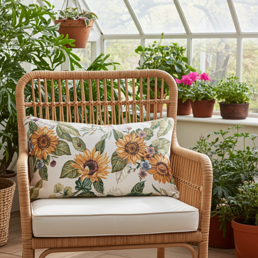 Die Gobelin Kissenhülle „Sonnenblumen & Glückskäfer“ im modernen Format 30 × 50 cm bringt sommerliche Frische in Ihr Zuhause. Leuchtend gelbe Sonnenblüten, ergänzt durch blühende Blätter und kleine Marienkäfer, setzen auf hellem beigem Hintergrund freundliche Akzente. Das farbenfrohe Motiv wirkt einladend und dekorativ und sorgt für eine lebendige Atmosphäre auf Sofa oder Bett.