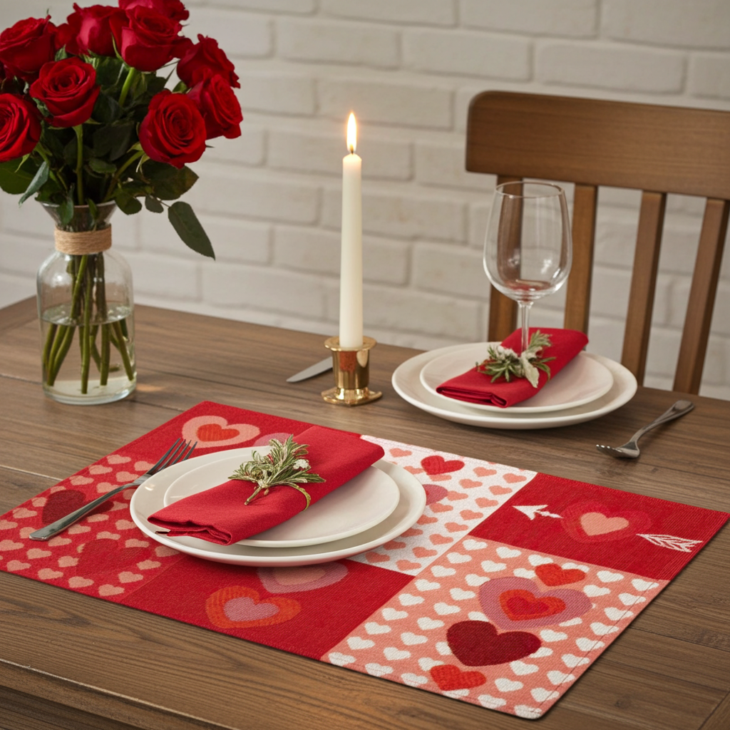 Das Gobelin Tischset „Herzschlag“ setzt mit seinem lebendigen Patchwork-Design einen herzlichen Akzent auf Ihrem gedeckten Tisch. Sechs unterschiedlich gestaltete Felder zeigen verschiedene Herzmotive – von kräftigem Rot mit hellen Herzen über weiße Flächen mit pinken Akzenten bis hin zu verspielten Mustern und einem Herz mit Pfeil. Das mediterran inspirierte Design erinnert an Landhausstil und eignet sich ideal für eine stimmungsvolle Tischdekoration, besonders zur Valentinszeit.
